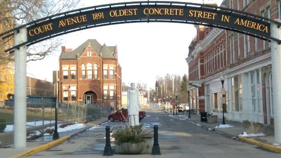 The first concrete pavement constructed in the U.S. was Court Ave, built next to Logan County Courthouse in Bellefontaine, Ohio. George W. Bartholomew who founded the Buckeye Portland Cement Company, built the section in 1891 after advocating for it for a few years. He had to post a $5,000 bond for a 5 year guarantee. After the success of Court Ave, the other streets surrounding the Courthouse Square were paved in concrete as well.